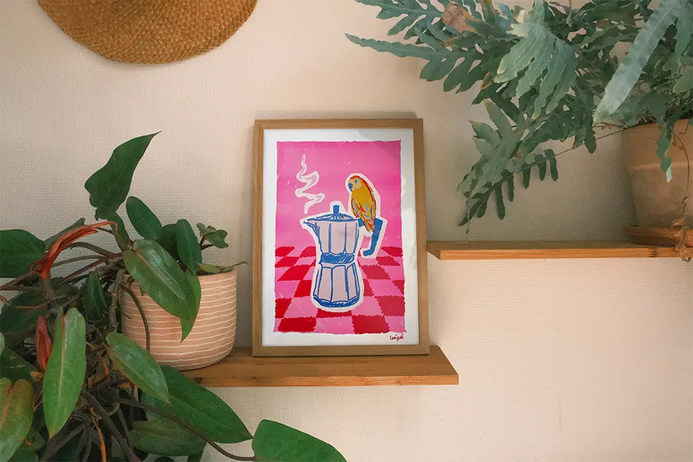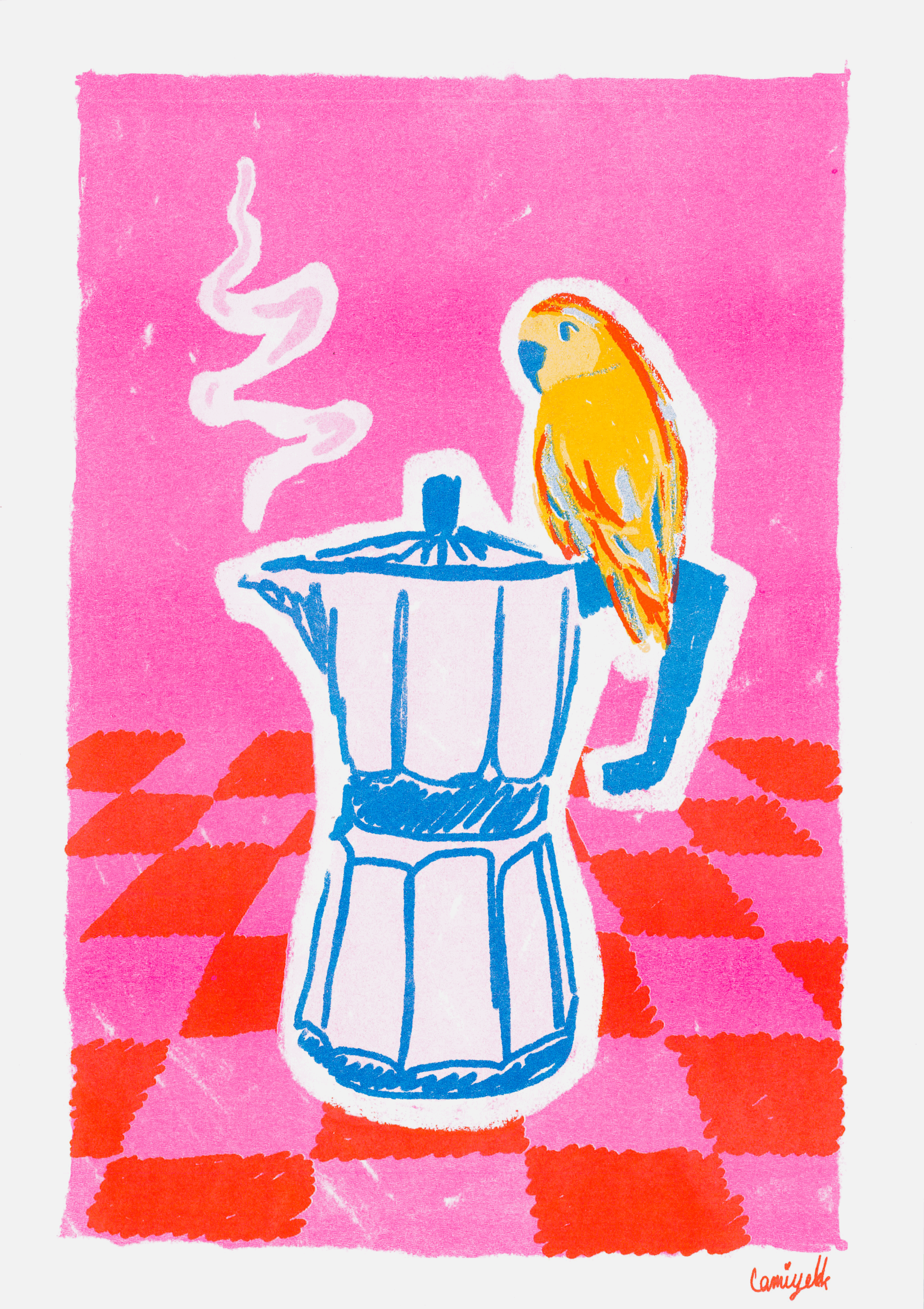 Impression en risographie en série limitée. Tirage imprimé avec soin et signé. Papier 230g. Technique originale : Risographie